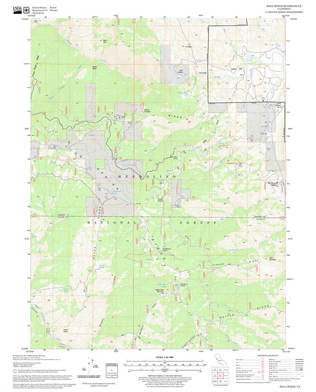 United States Department of Agriculture Forestry Service topographical map of Hall Ridge, Mendocino National Forest, California.
