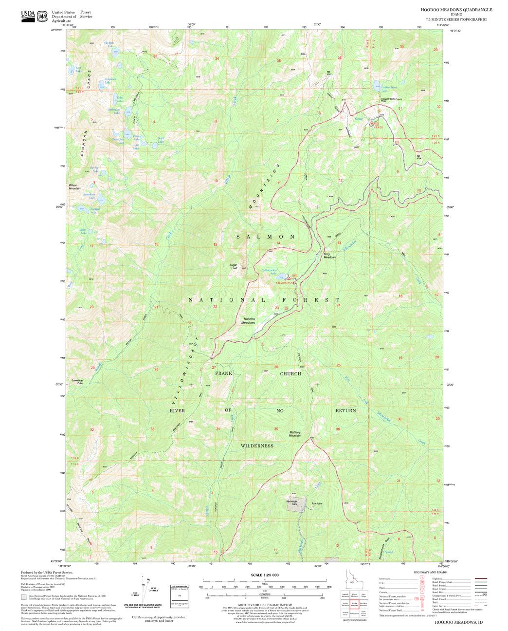 United States Department of Agriculture Forestry Service topographical map of Hoodoo Meadows, Salmon-Chalis National Forest, Idaho.