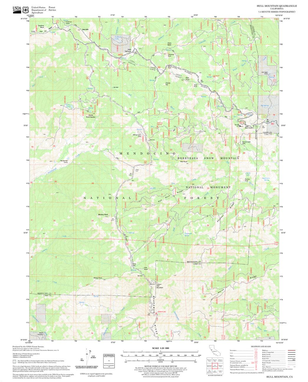 United States Department of Agriculture Forestry Service topographical map of Hull Mountain, Mendocino National Forest, California.