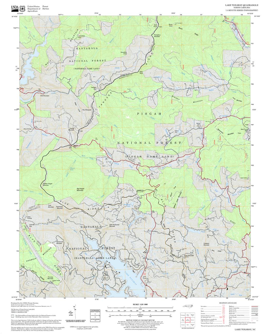 United States Department of Agriculture Forestry Service topographical map of Lake Toxaway, Pisgah National Forest, North Carolina.