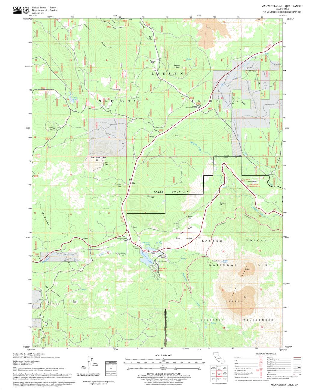 United States Department of Agriculture Forestry Service topographical map of Manzanita Lake, Lassen National Forest, California.