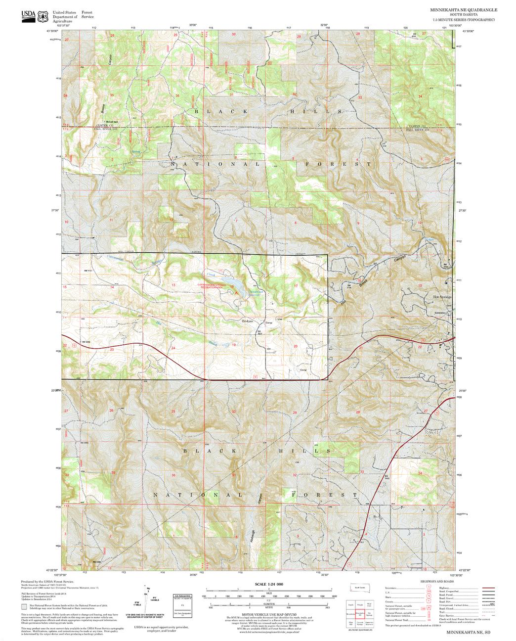 United States Department of Agriculture Forestry Service topographical map of Minnekahta NE, Black Hills National Forest, South Dakota.