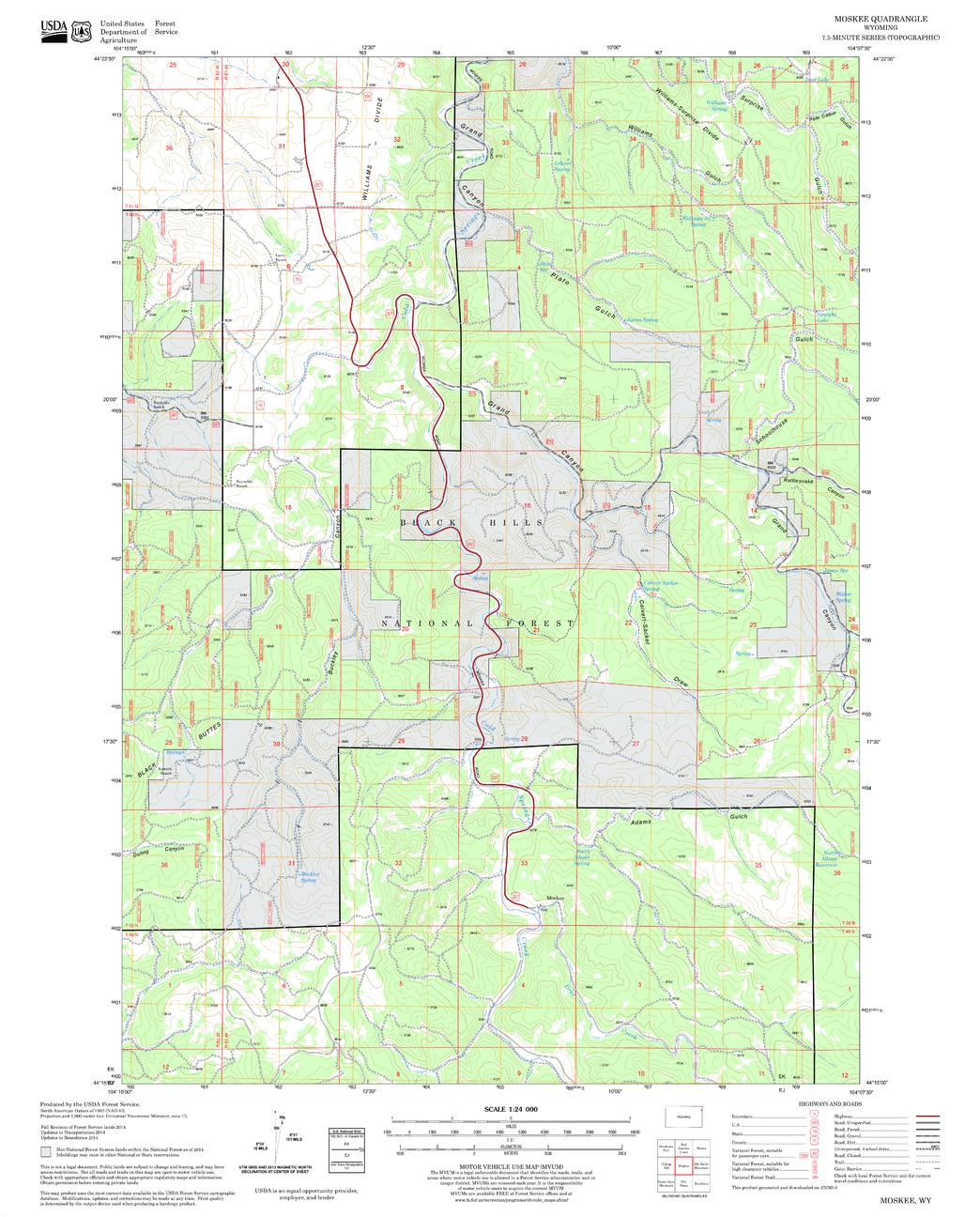 United States Department of Agriculture Forestry Service topographical map of Moskee, Black Hills National Forest, South Dakota.