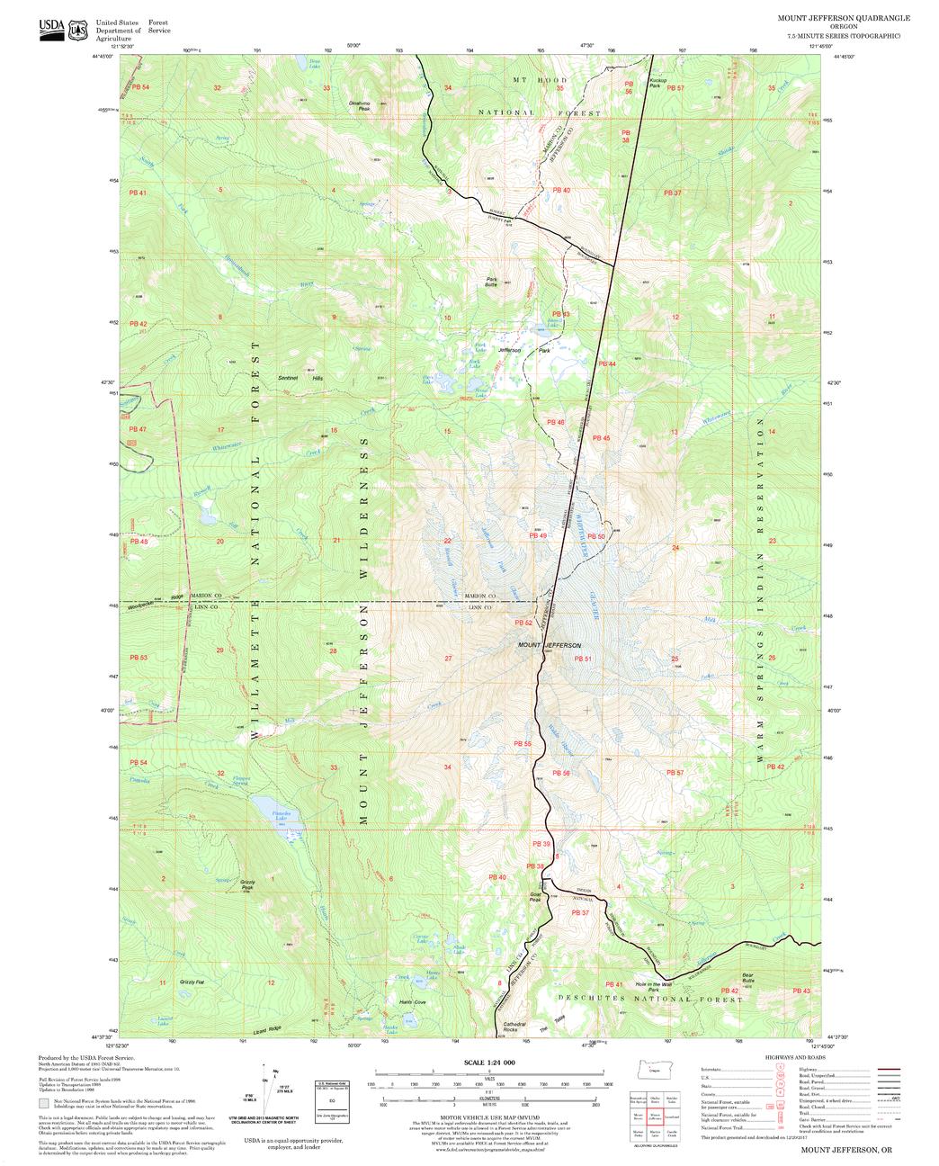 United States Department of Agriculture Forestry Service topographical map of Mount Jefferson, Deschutes National Forest, Oregon.