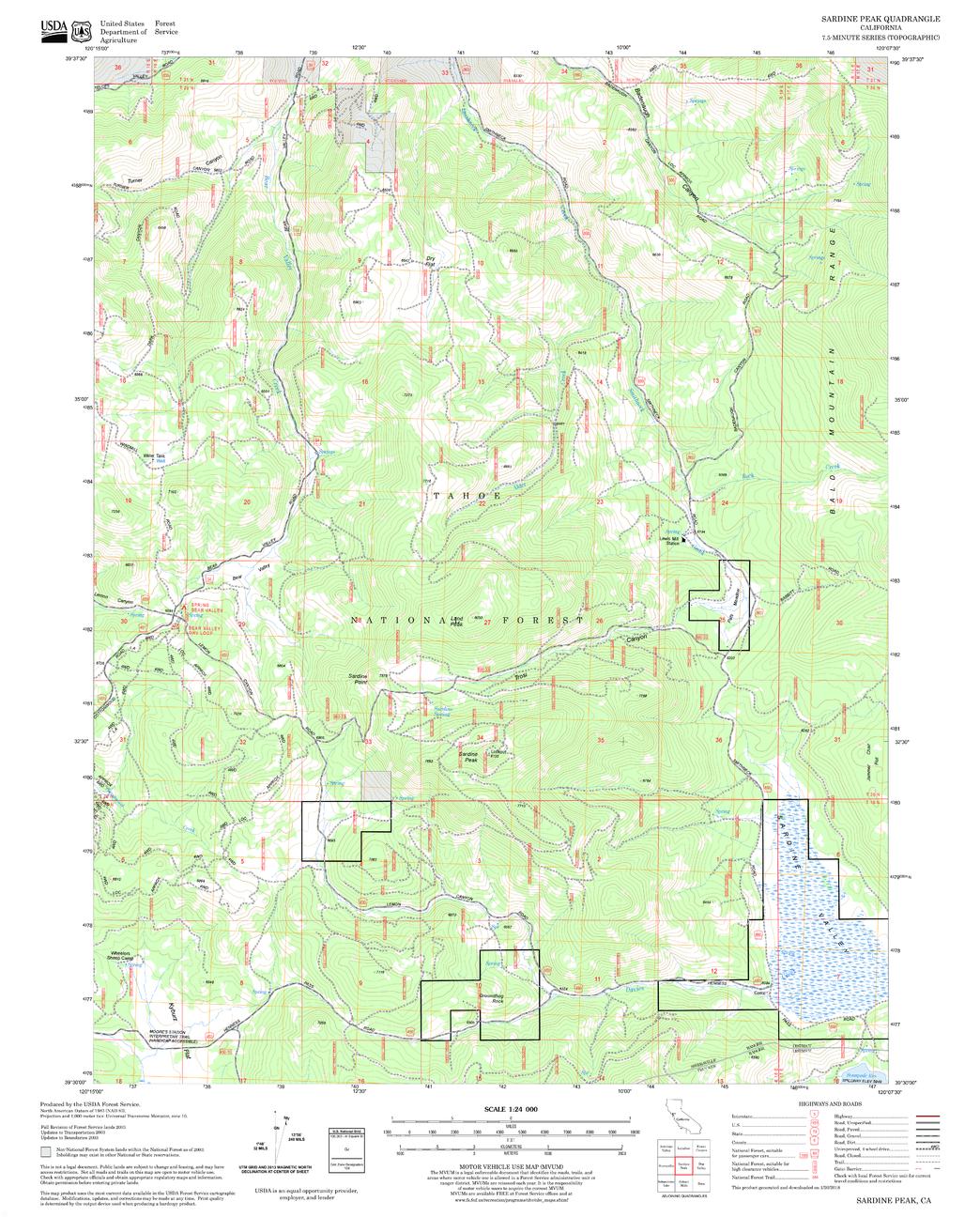 United States Department of Agriculture Forestry Service topographical map of Sardine Peak, Tahoe National Forest, California.