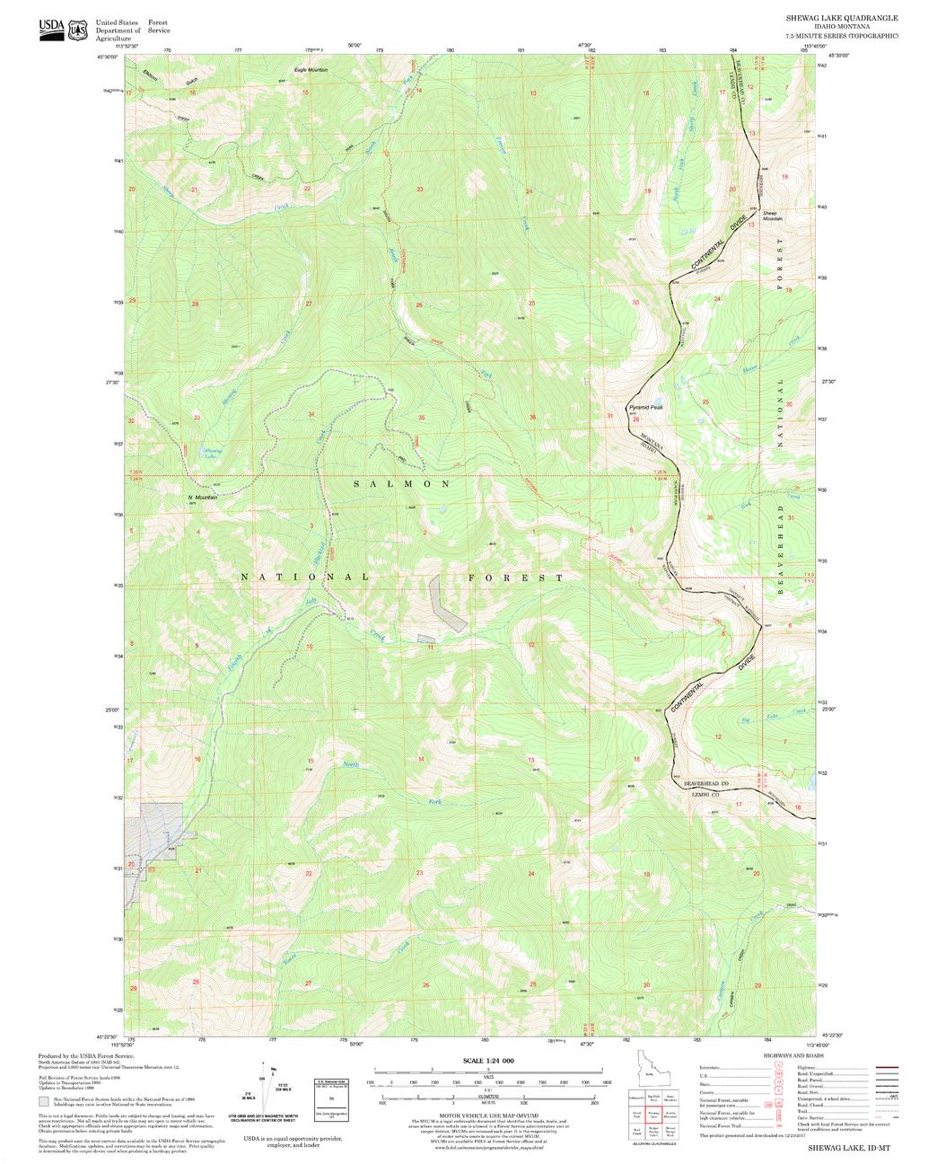 United States Department of Agriculture Forestry Service topographical map of Shewag Lake, Salmon-Chalis National Forest, Idaho.