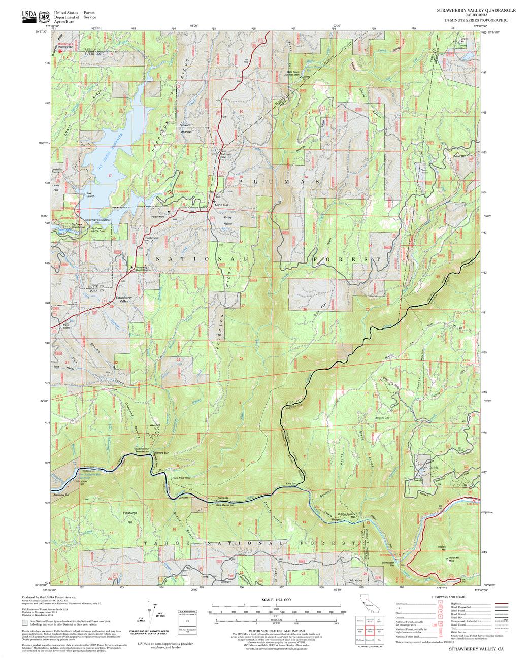 United States Department of Agriculture Forestry Service topographical map of Strawberry Valley, Tahoe National Forest, California.