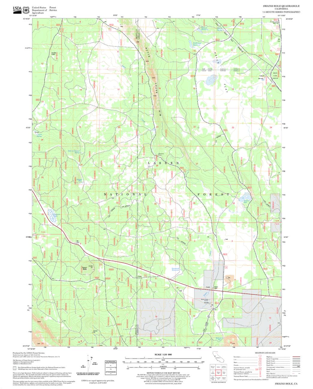 United States Department of Agriculture Forestry Service topographical map of Swains Hole, Lassen National Forest, California.