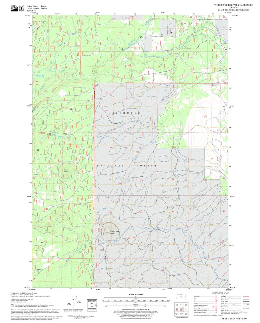 United States Department of Agriculture Forestry Service topographical map of Three Creek Butte, Deschutes National Forest, Oregon.
