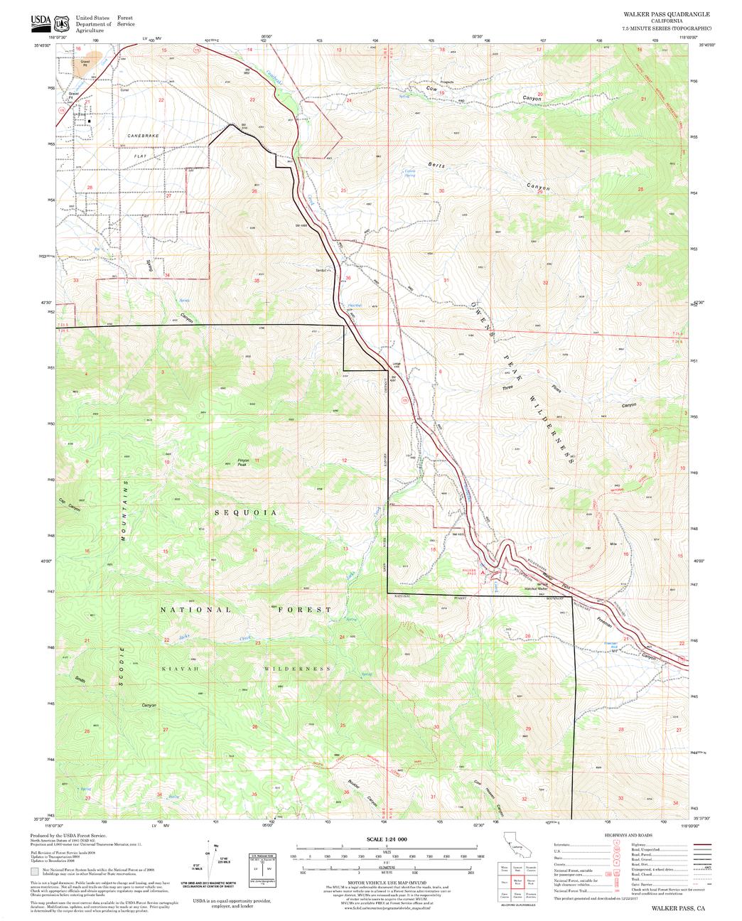 United States Department of Agriculture Forestry Service topographical map of Walker Pass, Sequoia National Forest, California.