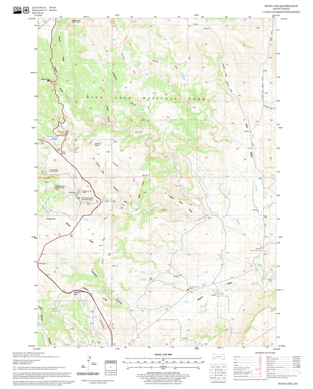 United States Department of Agriculture Forestry Service topographical map of Wind Cave, Black Hills National Forest, South Dakota.