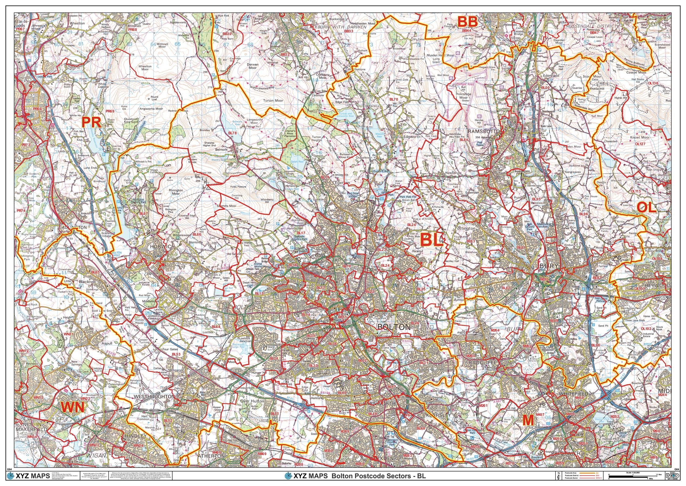 The Bolton Postcode Sector Wall Map shows detailed postcode sector boundaries (BL1 1, BL1 2) on a comprehensive background and is perfect for determining postcode boundaries for sales areas, planning mailshots and also an excellent reference for logistics. This wall map covers the whole of the BL Postcode Area.
