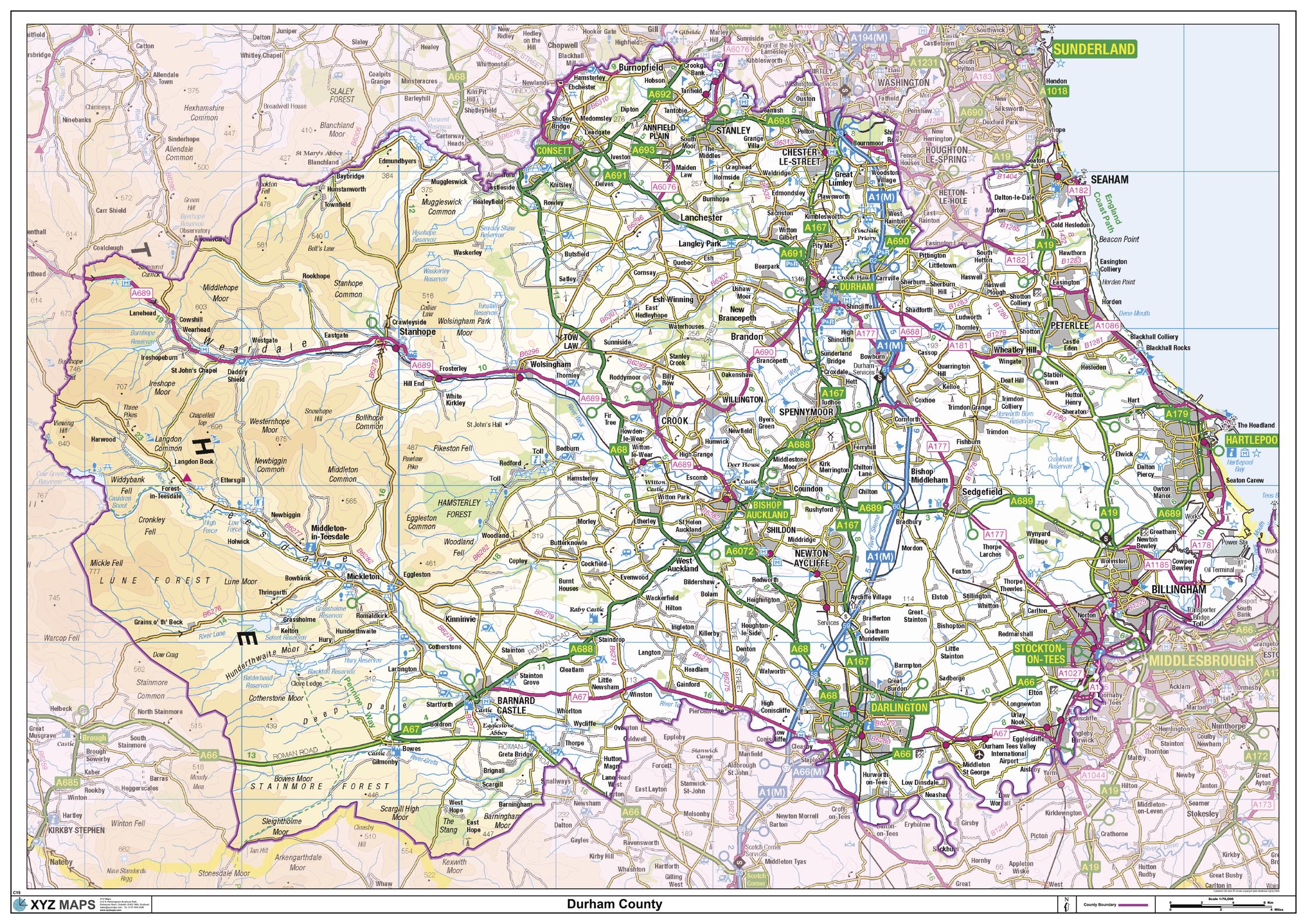 This is a large ceremonial county map of County Durham highlighting the county border, with the surrounding area faded out for excellent contrast. The map covers Barnard Castle, Billingham, Blaydon, Darlington, Durham, Gateshead, Hartlepool, Jarrow, South Shields, Stockton-on-Tees, Sunderland and Washington. The county map shows the latest County and Unitary Authority Boundaries, Overlaid on a Clear and Easy to Read Ordnance Survey map.