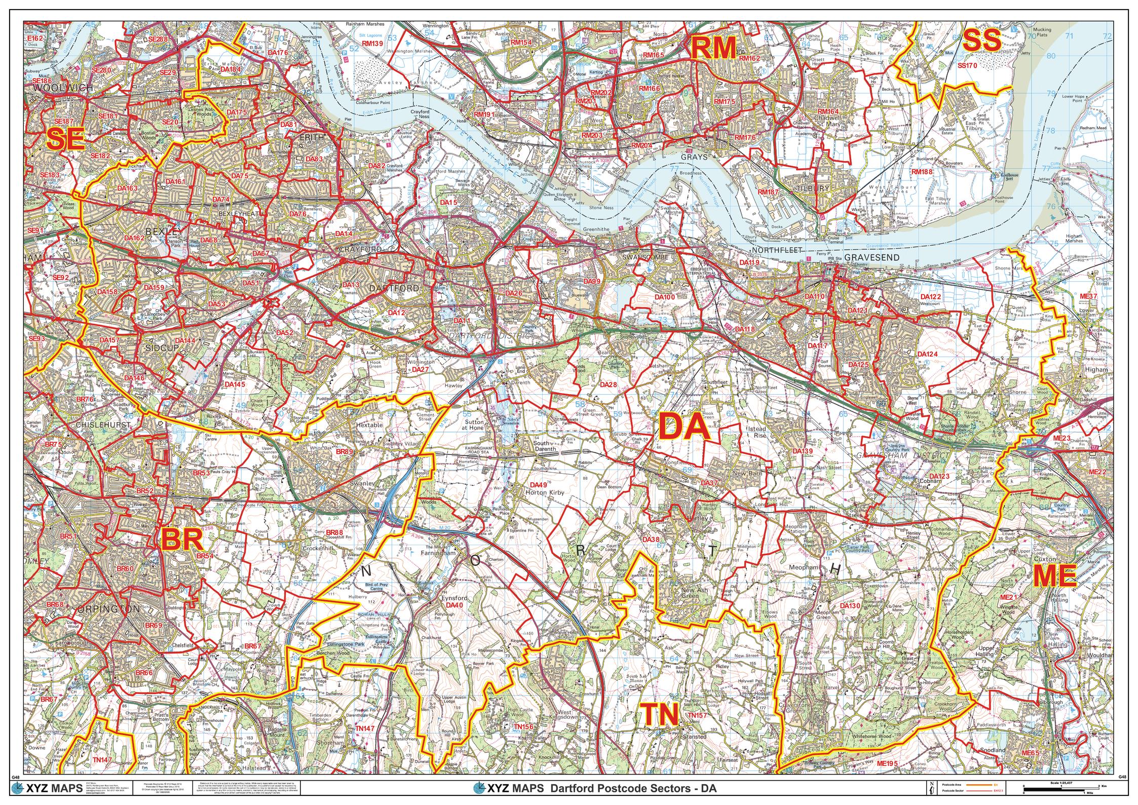 The Dartford Postcode Sector Wall Map shows detailed postcode sector boundaries (DA1 1, DA1 2) on a comprehensive background and is perfect for determining postcode boundaries for sales areas, planning mailshots and also an excellent reference for logistics. This wall map covers the whole of the DA Postcode Area.