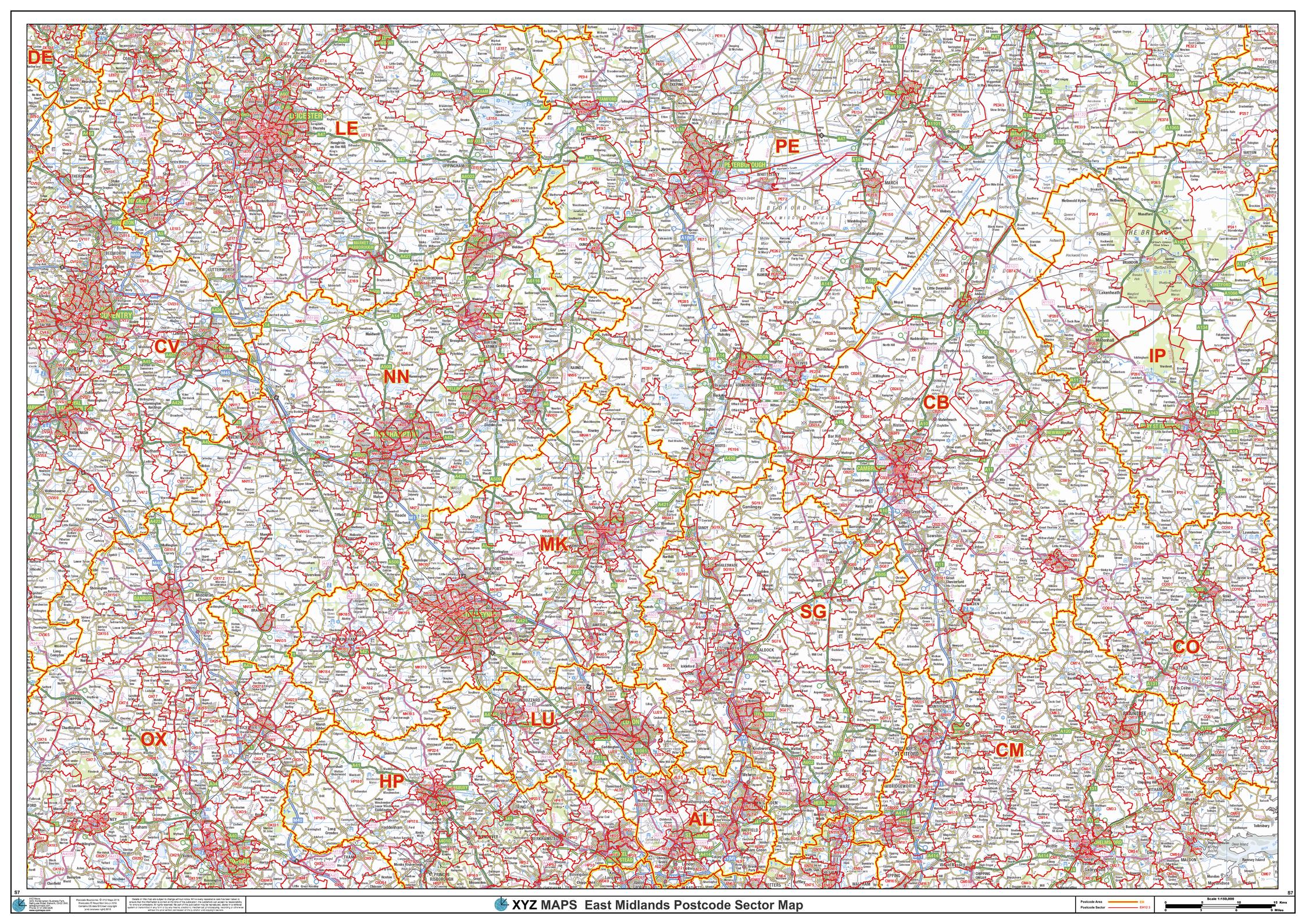 The East Midlands Postcode Sector Wall Map shows detailed postcode sector boundaries along with its associated label (NN1 1, NN1 2) on a comprehensive background and is perfect for determining postcode boundaries, for sales, logistics, planning mailshots or as a regional reference guide.