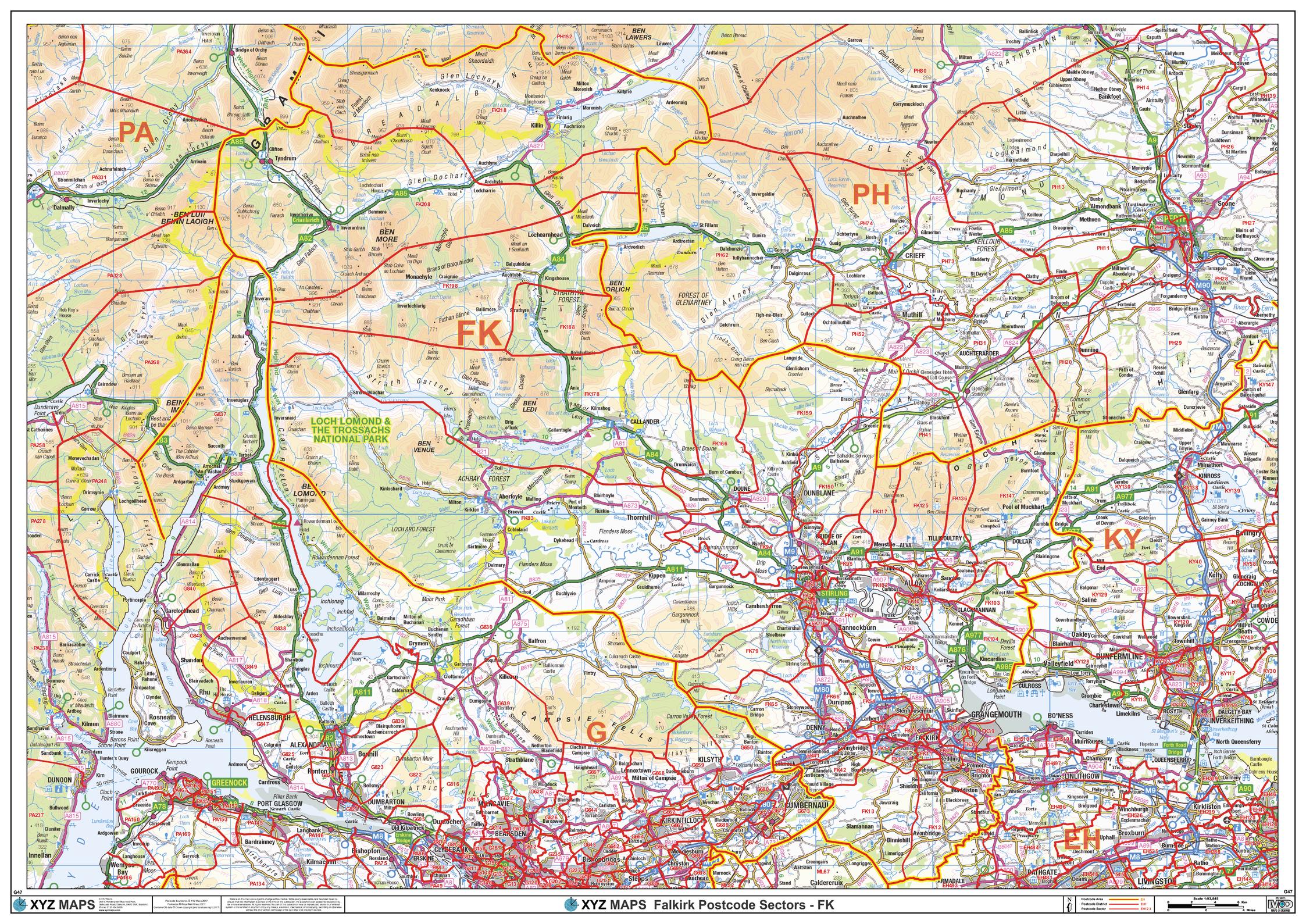 The Falkirk Postcode Sector Wall Map shows detailed postcode sector boundaries (FK1 1, FK1 2) on a comprehensive background and is perfect for determining postcode boundaries for sales areas, planning mailshots and also an excellent reference for logistics. This wall map covers the whole of the FK Postcode Area.