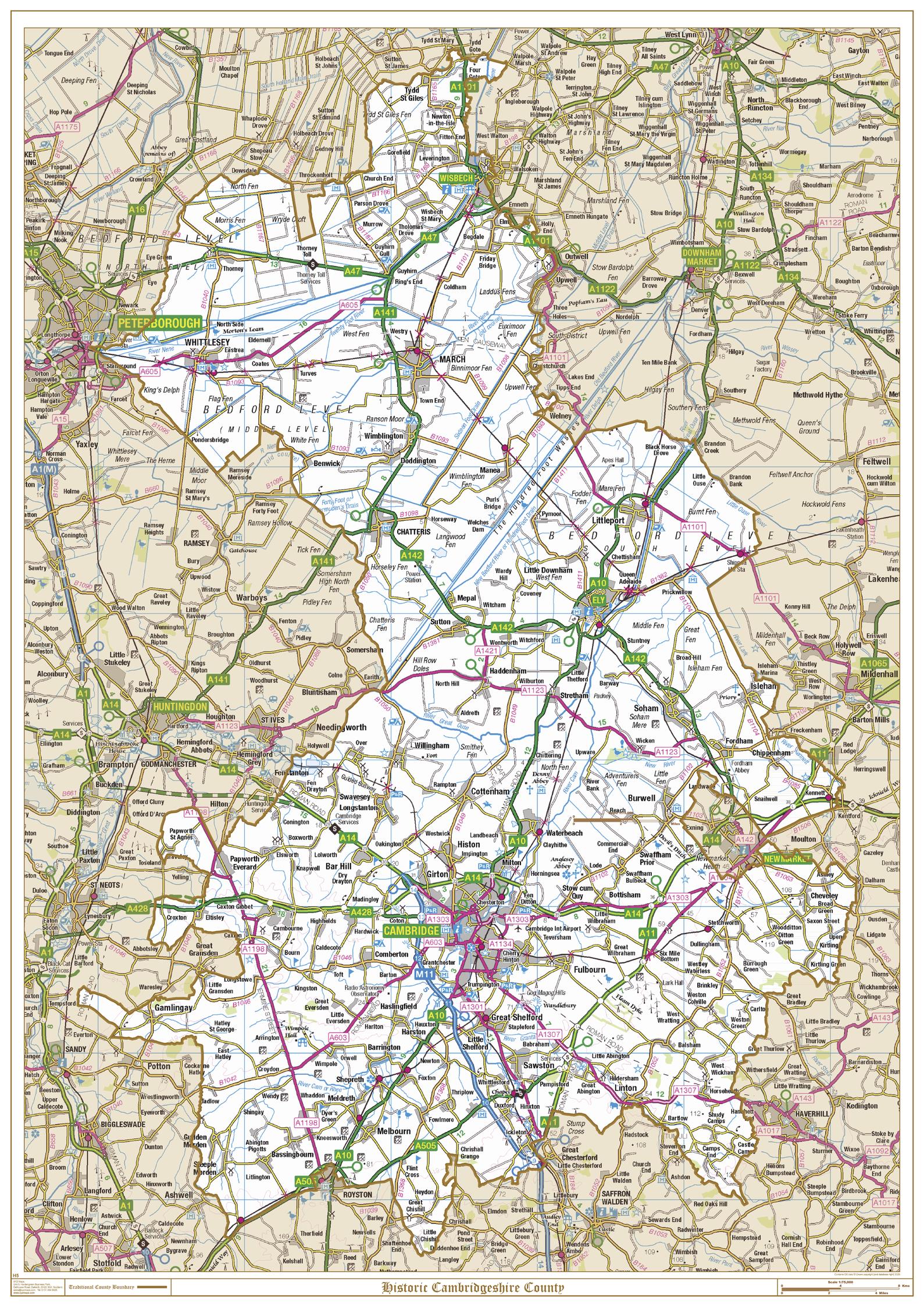 This is a historic county map of Cambridgeshire, highlighting the traditional county border, the surrounding area is faded out with a sepia tint for excellent contrast. The historic map covers Wisbech, Whittlesey, Chatteris, March, Ely, and Cambridge. The traditional county map has the historic county boundaries overlaid on an up to date Ordnance Survey 1:250,000 scale map.