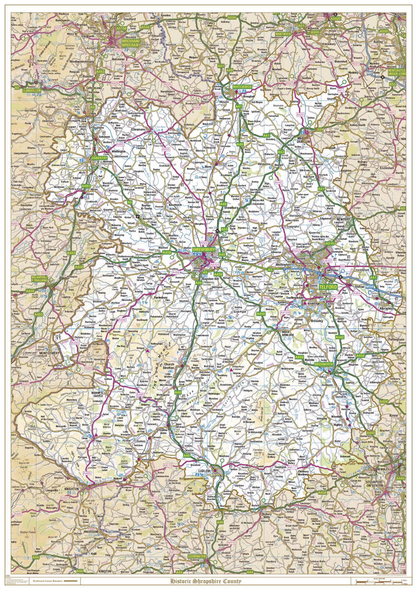 This is a historic county map of Shropshire, highlighting the traditional county border, the surrounding area is faded out with a sepia tint for excellent contrast. The historic map covers, Whitchurch, Oswestry, Newport, Shrewsbury, Telford, Bridgnorth, Church Stretton, Bishops Castle, and Ludlow. The traditional county map has the historic county boundaries overlaid on an up to date Ordnance Survey 1:250,000 scale map.