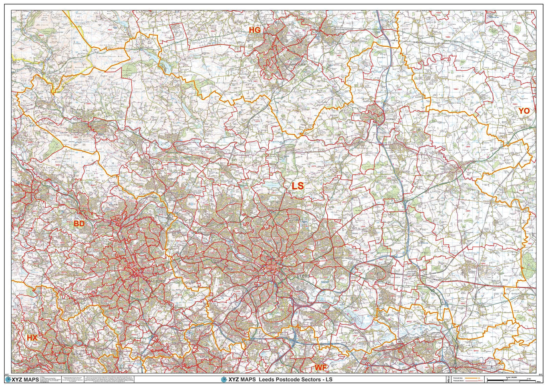 The Leeds Postcode Sector Wall Map shows detailed postcode sector boundaries (LS1 1, LS1 2) on a comprehensive background and is perfect for determining postcode boundaries for sales areas, planning mailshots and also an excellent reference for logistics. This wall map covers the whole of the LS Postcode Area.