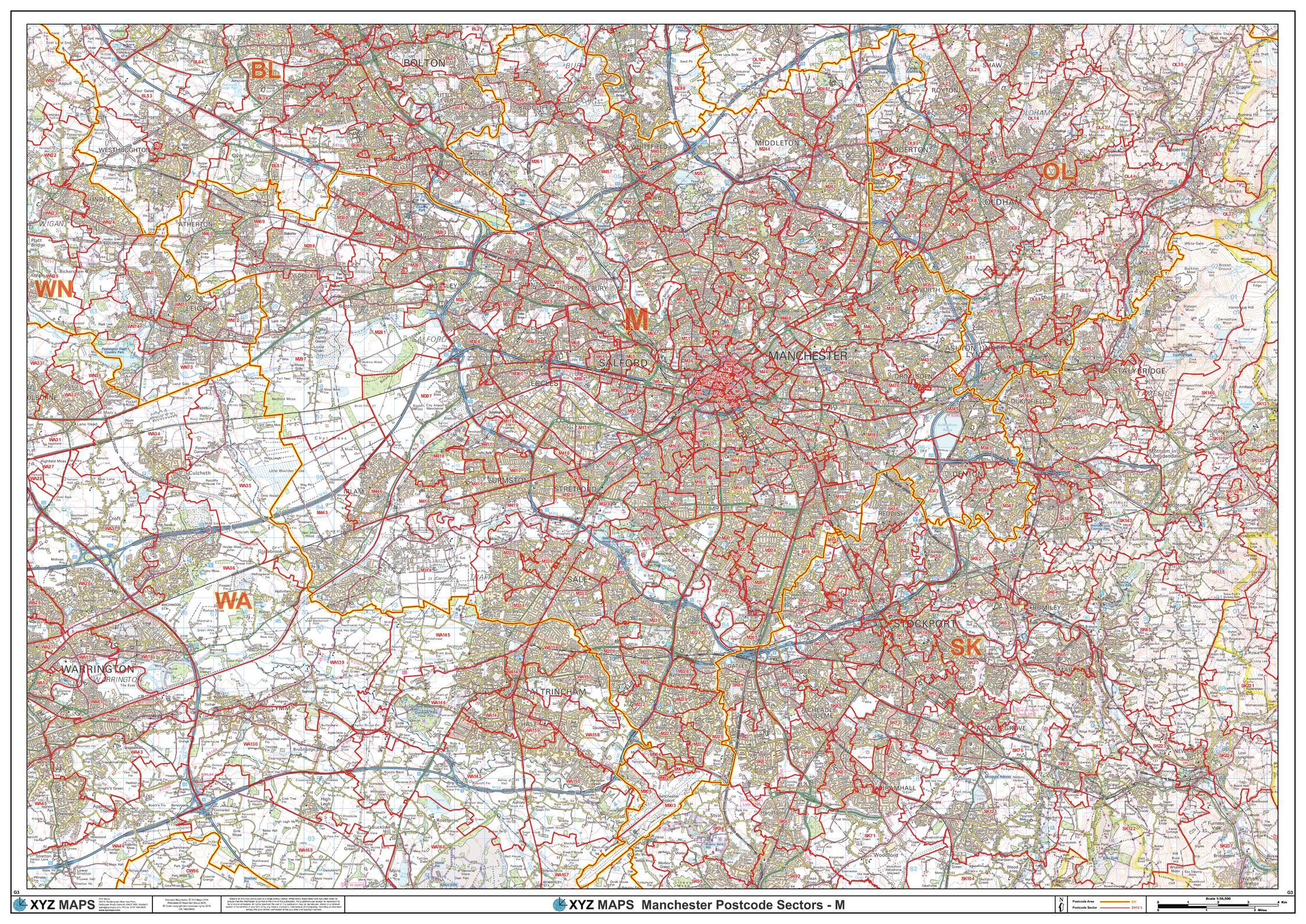 The Manchester Postcode Sector Wall Map shows detailed postcode sector boundaries (M1 1, M1 2) on a comprehensive background and is perfect for determining postcode boundaries for sales areas, planning mailshots and also an excellent reference for logistics. This wall map covers the whole of the M Postcode Area.