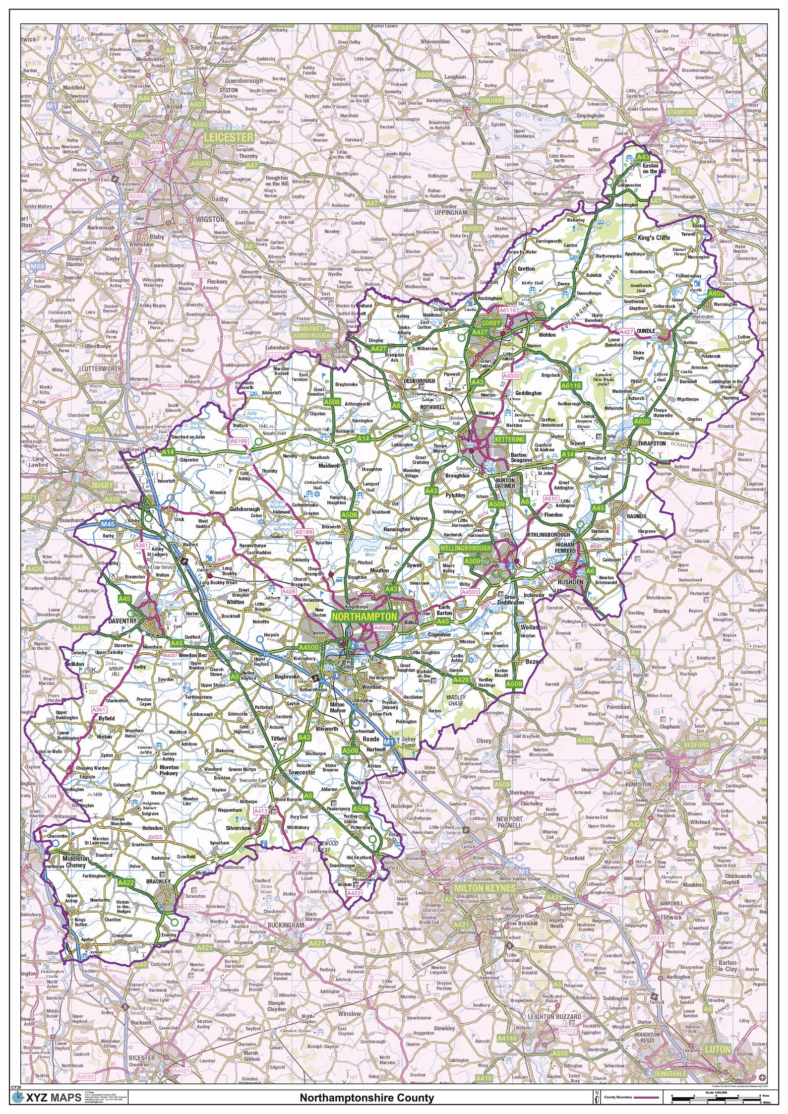 This is a large ceremonial county map of Northamptonshire highlighting the county border, with the surrounding area faded out for excellent contrast. The map covers Brackley, Brixworth, Corby, Daventry, Earls Barton, Irthlingborough, Kettering, Northampton, Oundle, Rushden, Peterborough, Silverstone, Towcester and Wellingborough. The county map shows the latest County and Unitary Authority Boundaries, Overlaid on a Clear and Easy to Read Ordnance Survey map.