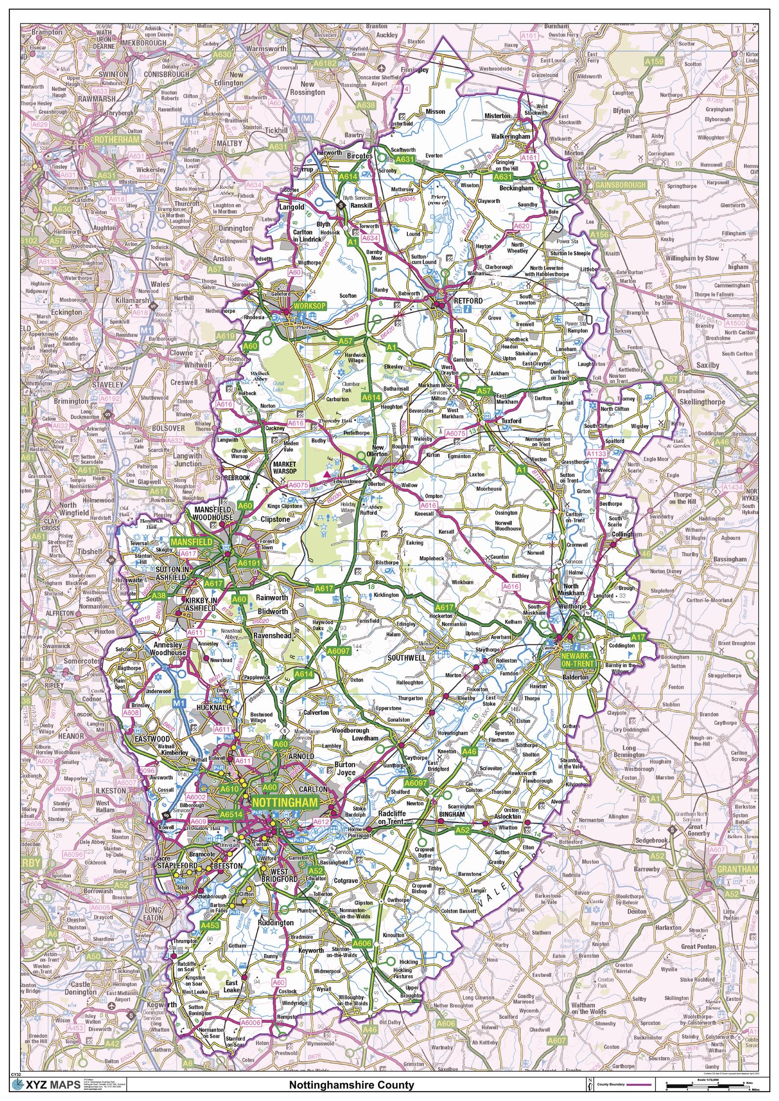 This is a large ceremonial county map of Nottinghamshire highlighting the county border, with the surrounding area faded out for excellent contrast. The map covers Beeston, Blidworth, Eastwood, Edwinstone, Mansfield, Newark on Trent, Nottingham, Retford, Southwell and Worksop. The county map shows the latest County and Unitary Authority Boundaries, Overlaid on a Clear and Easy to Read Ordnance Survey map.