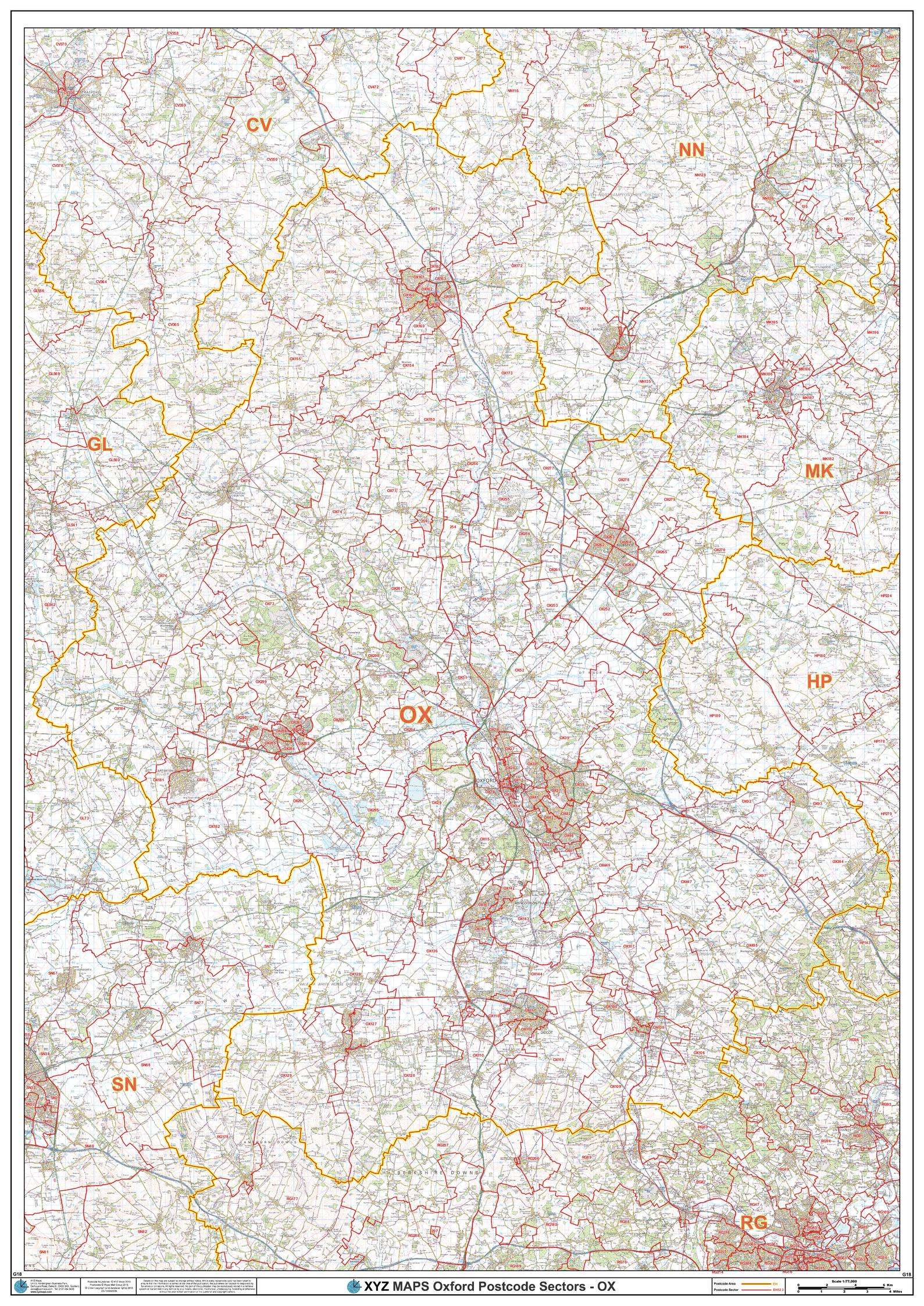 The Oxford Postcode Sector Wall Map shows detailed postcode sector boundaries (OX1 1, OX1 2) on a comprehensive background and is perfect for determining postcode boundaries for sales areas, planning mailshots and also an excellent reference for logistics. This wall map covers the whole of the OX Postcode Area.