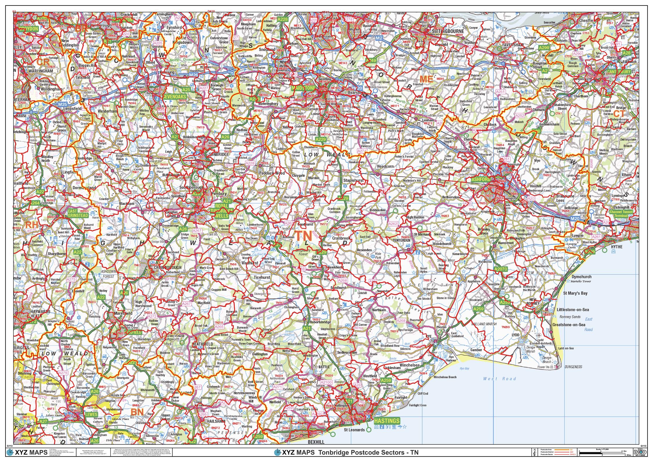 The Tonbridge Postcode Sector Wall Map shows detailed postcode sector boundaries (TN1 1, TN1 2) on a comprehensive background and is perfect for determining postcode boundaries for sales areas, planning mailshots and also an excellent reference for logistics. This wall map covers the whole of the TN Postcode Area.