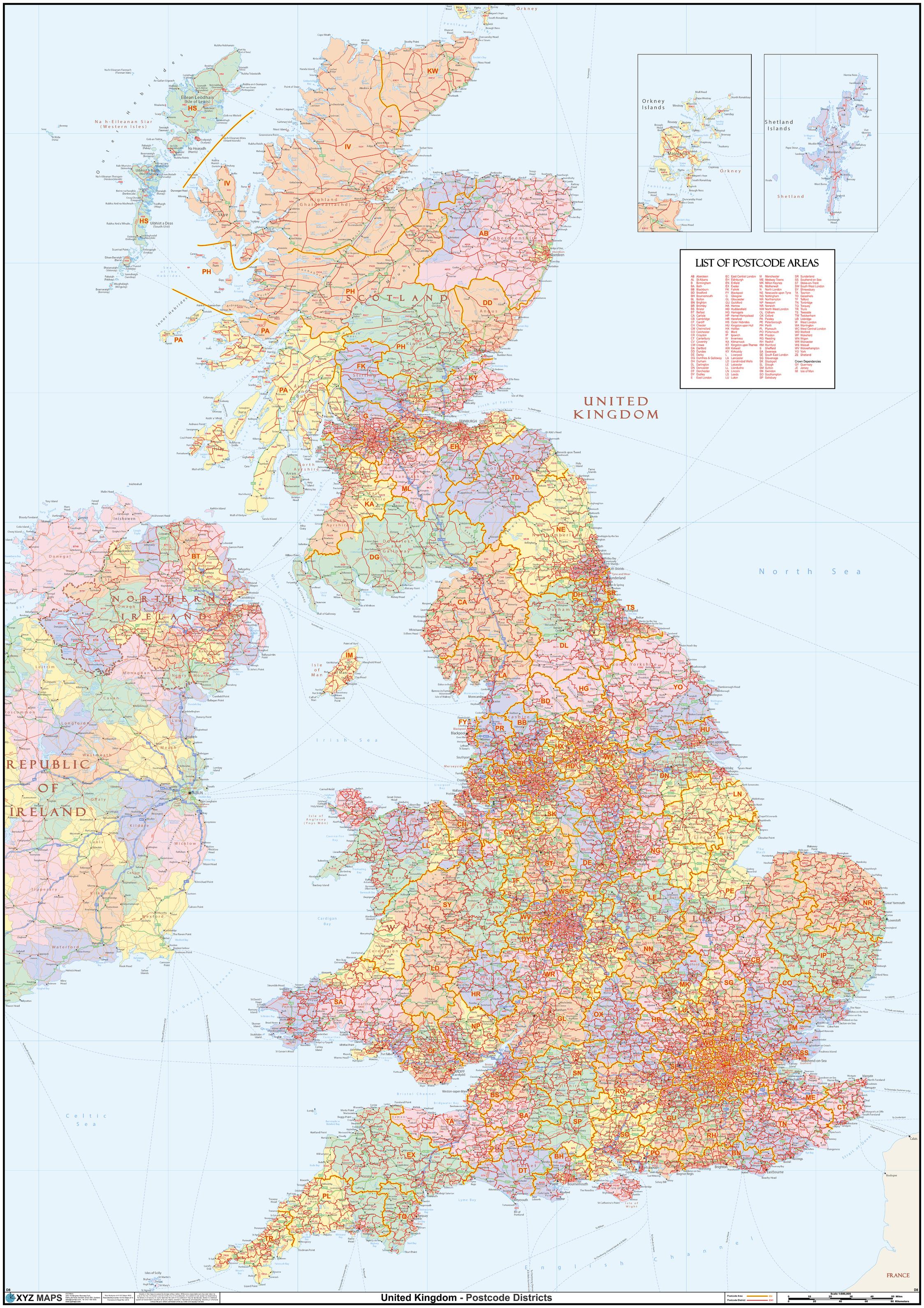 This huge UK Political Postcode District Wall Map is 2A in size (1189mm x 1682mm, 4ft x 6ft). We believe it is the only single wall map to cover the United Kingdom at postcode district level. The map features a political map base showing the counties and unitary authorities in pastel colours.