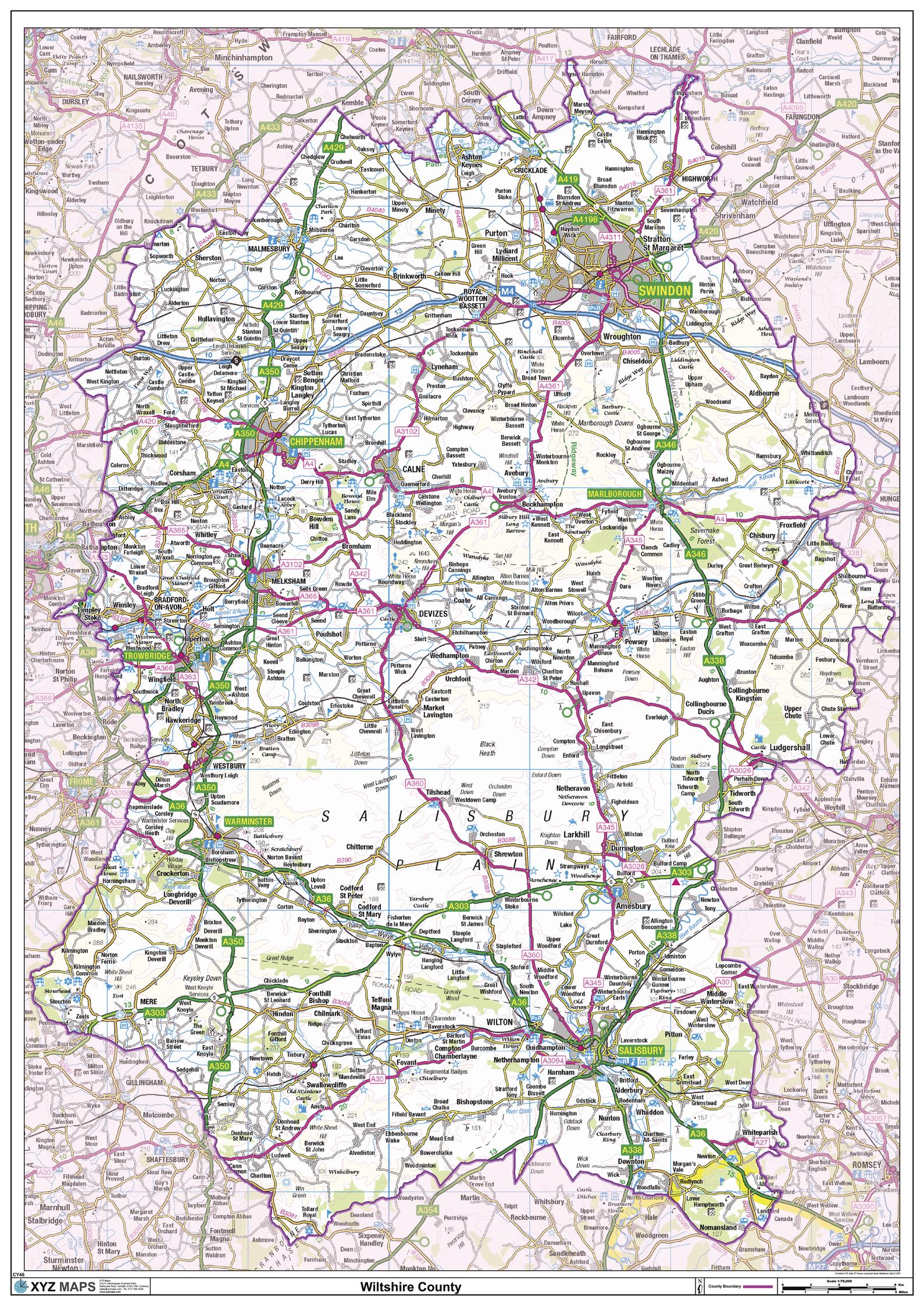 This is a large ceremonial county map of Wiltshire highlighting the county border, with the surrounding area faded out for excellent contrast. The map covers Bradford on Avon, Chippenham, Devizes, Malmesbury, Marlborough, Melksham, Salisbury, Swindon, Trowbridge and Warminster. The county map shows the latest County and Unitary Authority Boundaries, overlaid on a clear and easy to read Ordnance Survey map.