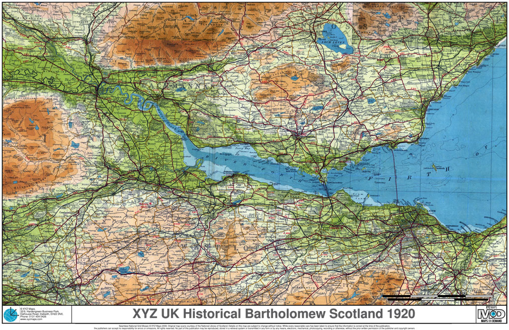Bartholomew mapping at 1:126 000 in the same style as the revolutionary Survey Atlas of Scotland (1912), the first recognisably ‘modern’ atlas mapping. These maps date from the 1920s and give hours of interest given the changes that have occurred since. Converted to the present day GB National Grid.