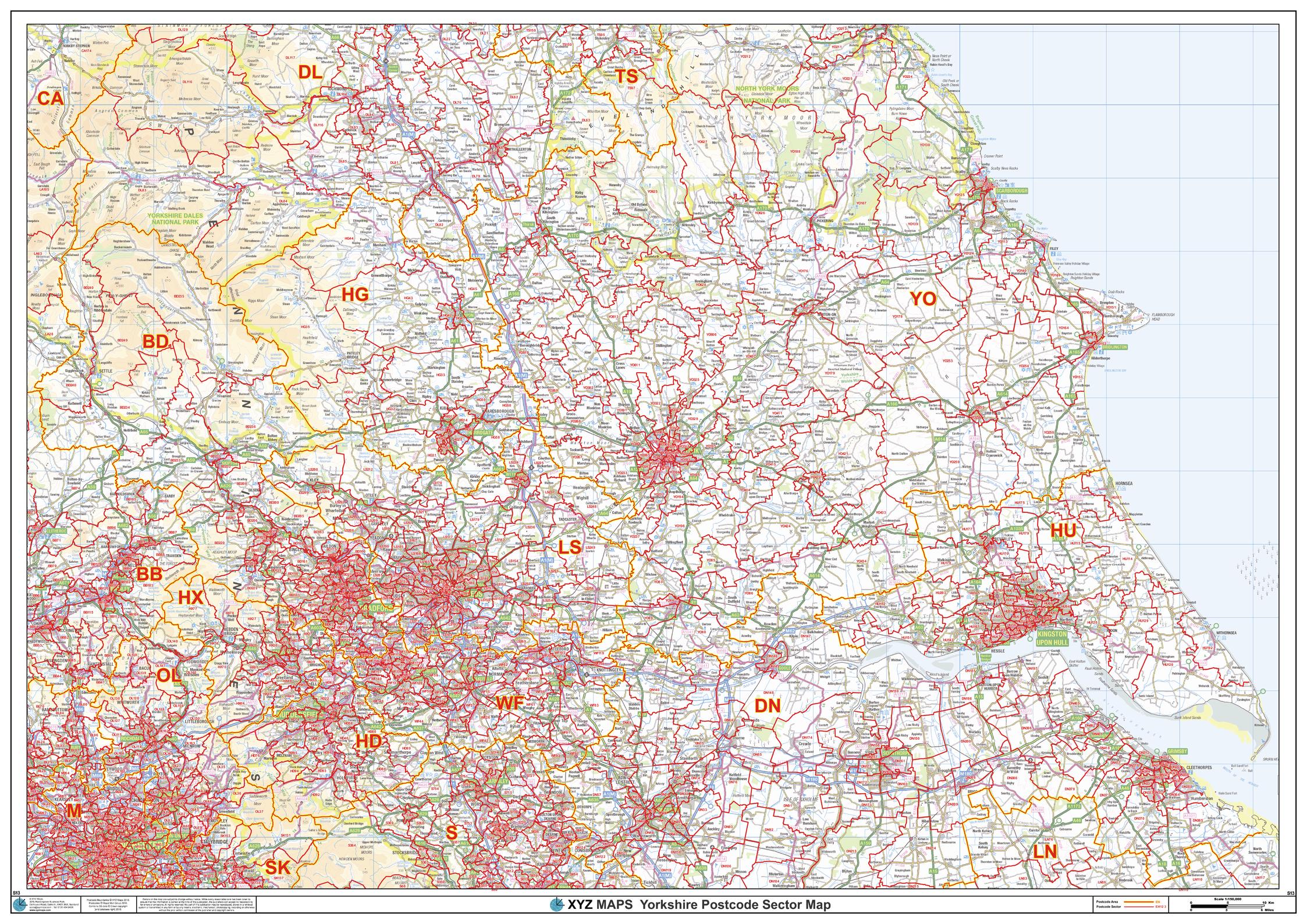 The Yorkshire Postcode Sector Wall Map shows detailed postcode sector boundaries along with its associated label (YO1 1, YO1 2) on a comprehensive background and is perfect for determining postcode boundaries, for sales, logistics, planning mailshots or as a regional reference guide.